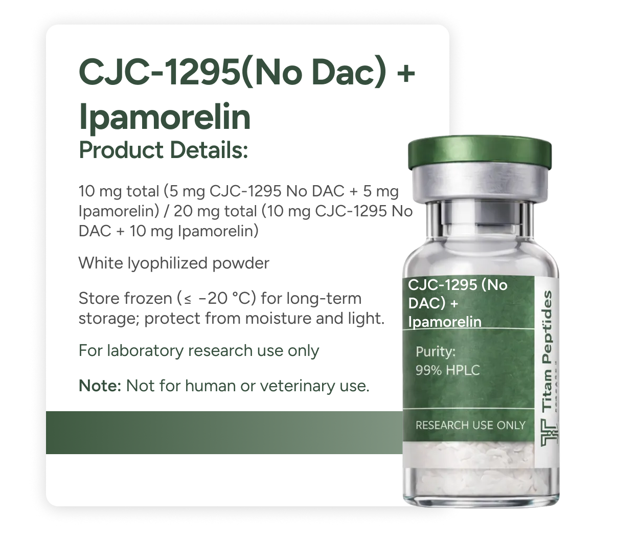 - Contents: 10 mg total (5 mg CJC-1295 No DAC + 5 mg Ipamorelin) / 20 mg total (10 mg CJC-1295 No DAC + 10 mg Ipamorelin)