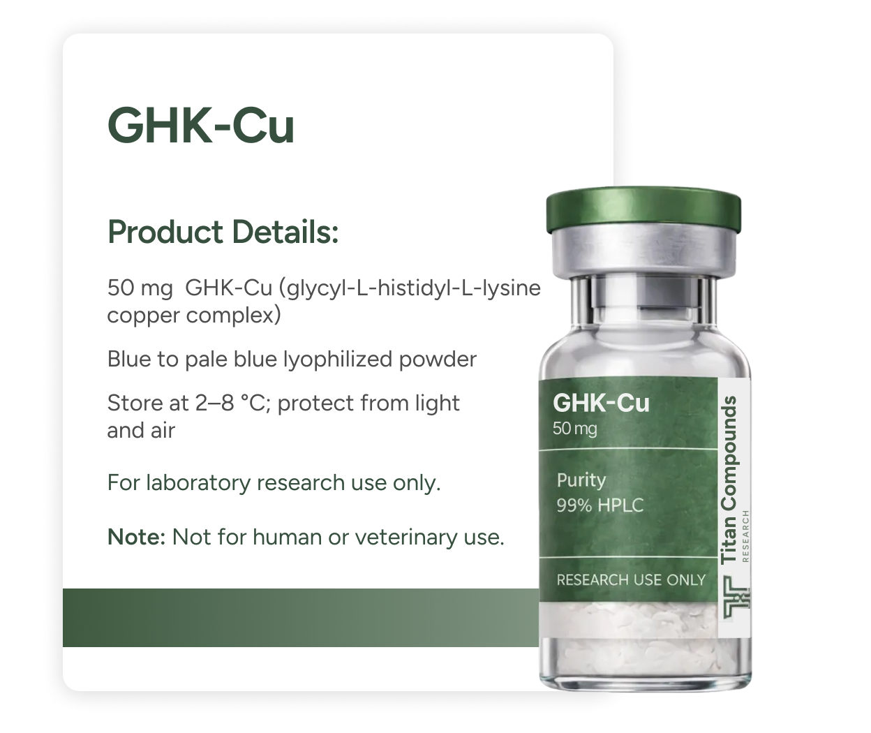 Description: GHK-Cu is a copper(II) complex of the naturally occurring tripeptide glycyl-L-histidyl-L-lysine (GHK). In research settings, GHK-Cu is used to investigate copper-dependent tissue remodeling and repair pathways, including extracellular matrix regulation (e.g., collagen/proteoglycan balance and matrix metalloproteinase activity) and wound-repair signaling in cellular and tissue models.