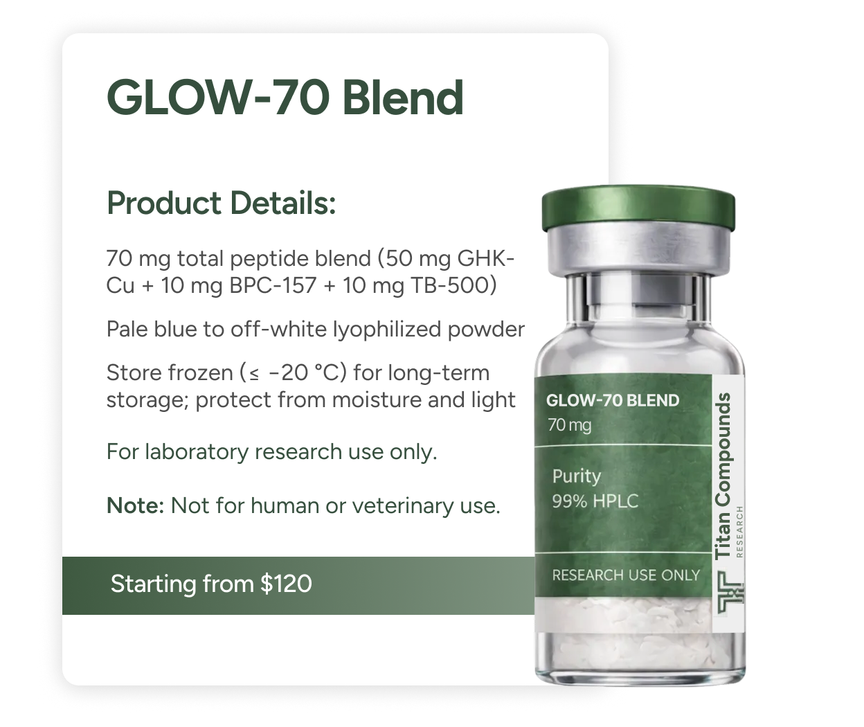 peptide (BPC-157), a copper-mediated wound-healing peptide (GHK-Cu), and a regenerative signaling peptide (TB-500), the GLOW blend allows investigators to explore the potential additive or synergistic effects on cellular repair, angiogenesis, and extracellular matrix