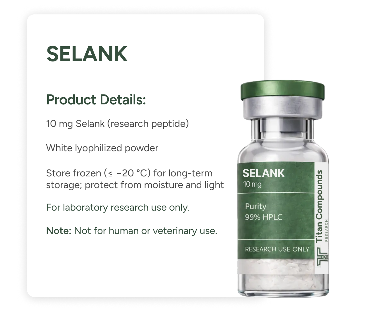 - Contents: 10 mg Selank (research peptide)