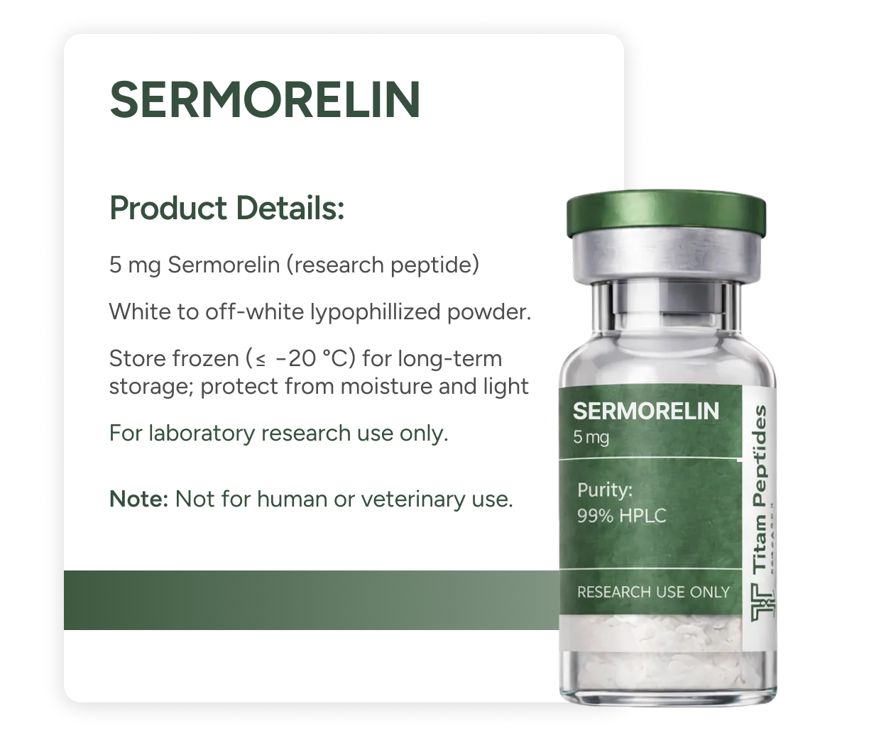 Description: Sermorelin is a 29-amino-acid synthetic peptide corresponding to the N-terminal biologically active region of human growth hormone-releasing hormone (GHRH(1–29); growth hormone-releasing factor, GRF). It binds pituitary GHRH receptors (GHRHR) and stimulates endogenous growth hormone (GH) secretion. In research settings, sermorelin is used to investigate GH axis function and regulation of pulsatile GH release, including age-associated changes in GH signaling and downstream insulin-like growth factor-1 (IGF-1) physiology.